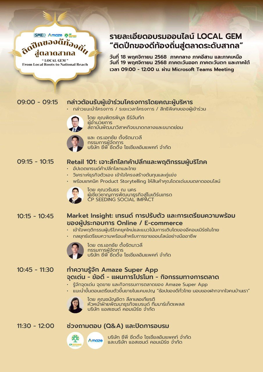 🌾 อบรมออนไลน์ฟรี! หัวข้อ Local GEM: ติดปีกของดีท้องถิ่นสู่ตลาดสากล